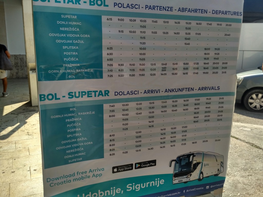 En el puerto de Split, se puede coger el ferry Split-Brač de la compañía Jadrolinija (es la compañía principal del mar Adriático). El ticket de ida y vuelta (la vuelta es abierta) cuesta 66 kunas (8,81€). Se puede comprar en la ventanilla del puerto de Split en el mismo momento de la salida y el trayecto dura unos 50 minutos.