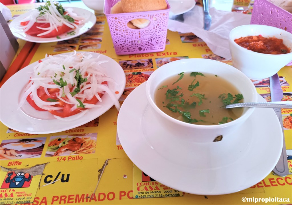 Cuando vayas a comer fuera, no será raro que te ofrezcan la ensalada tradicional como entrante. ¿Y cómo me la imagino cuando me la ofrezcan? Pues es muy simple, pero distinta a la ensalada típica que nos traerían en España. Esta tan solo lleva tomate, cebolla y cilantro o perejil. Está por doquier y es muy refrescante. Como decía, a mí me la pusieron junto con este caldo cuando pedí el pastel de choclo y también con las humitas.