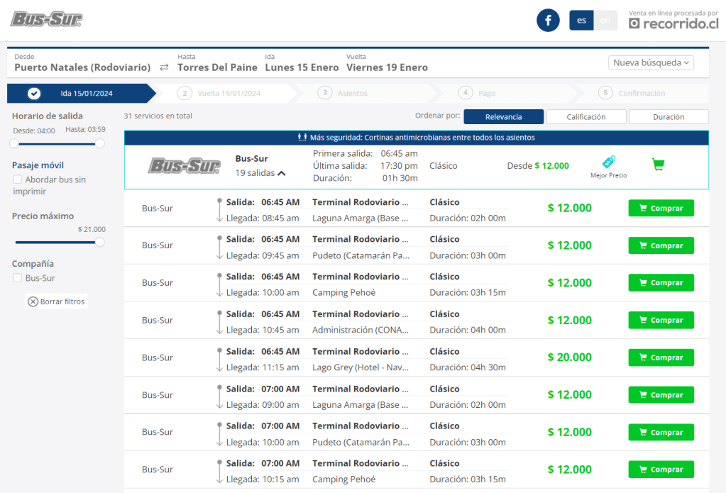 Si estás reservando todo por tu cuenta, tendrás que reservar también el transporte al Parque. Esto es muy sencillo, tan solo tienes que entrar en la web de la compañía de buses Bus Sur y seleccionar el trayecto de Rodoviario (la estación de bus de Puerto Natales) a Torres del Paine.