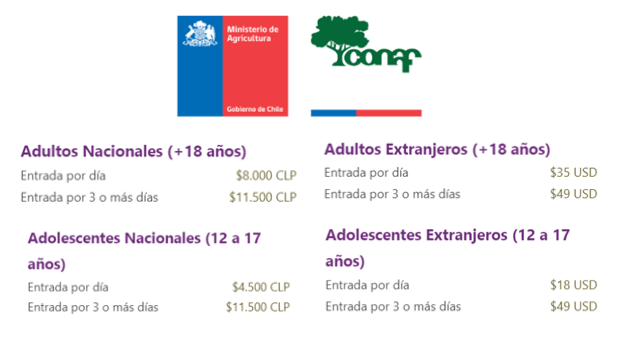 Si eres chileno, la entrada al parque cuesta $8.000 para visitas de 1-3 días u $11.500 para más de 3 días; y si eres extranjero, 35 USD para 1-3 días o 49 USD para más de 3 días (como los circuitos W y O), respectivamente. Puedes consultar aquí las tarifas actualizadas y los descuentos disponibles para determinadas franjas de edad y discapacidad, y comprar tu entrada en la web aspticket.cl.