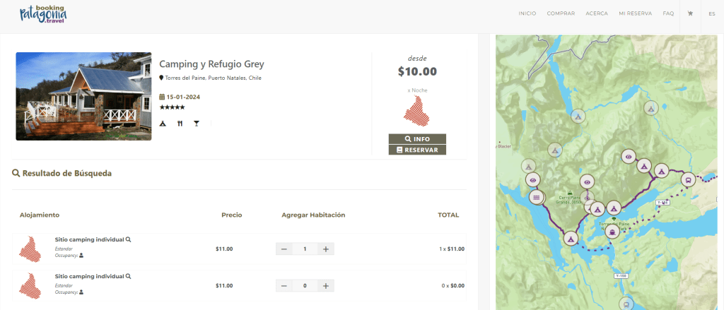 Te dejo a continuación un ejemplo de reserva para la primera noche de este circuito W que he buscado como ejemplo, en Camping Grey: